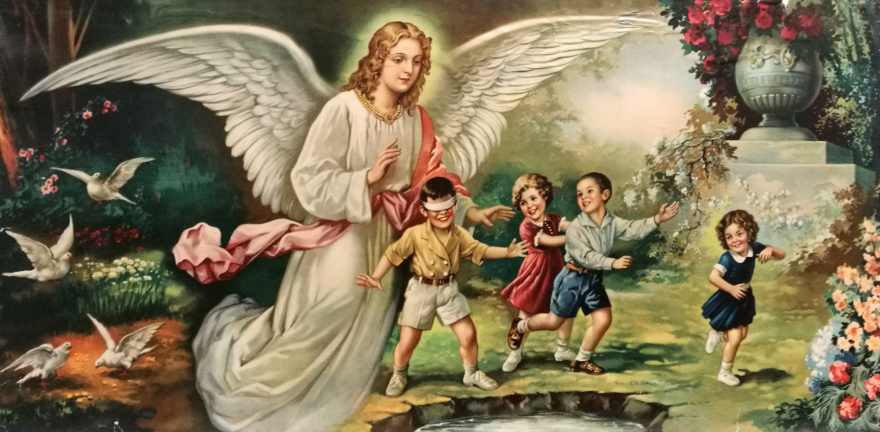 El niño de muy corta de edad se incorpora en su cuna y mira el cuadro que cuelga en la pared: el ángel de la guarda que velará sus sueños venideros.