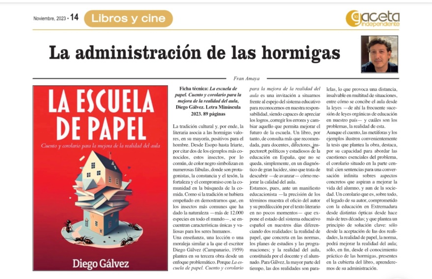 Comprometido durante décadas con el mundo de la enseñanza en Extremadura (como catedrático de inglés, director de instituto, inspector de educación o director general), Diego Gálvez es autor del manifiesto educacionista LA ESCUELA DE PAPEL (2023) y del libro de ficción IR AL CIELO (2022).