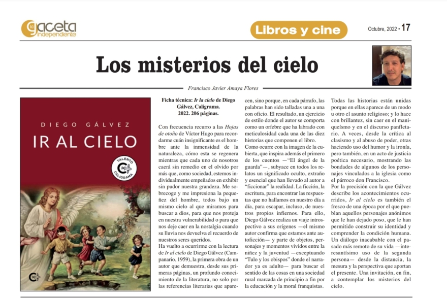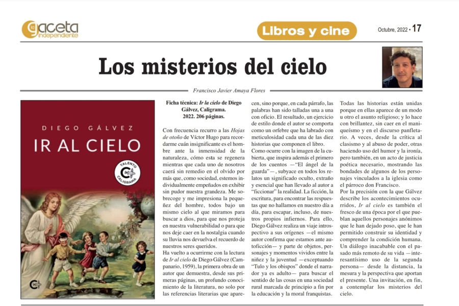 Por la precisión con la que Gálvez describe los acontecimientos ocurridos, Ir al cielo es también el fresco de una época por el que pueblan aquellos personajes anónimos que le han dejado poso, que le han permitido construir su identidad y comprender la condición humana. Un diálogo inacabable con el pasado más remoto de su vida —interesantísimo uso de la segunda persona— desde la distancia, la mesura y la perspectiva que aportan el presente. Una invitación, en fin, a contemplar los misterios del cielo.